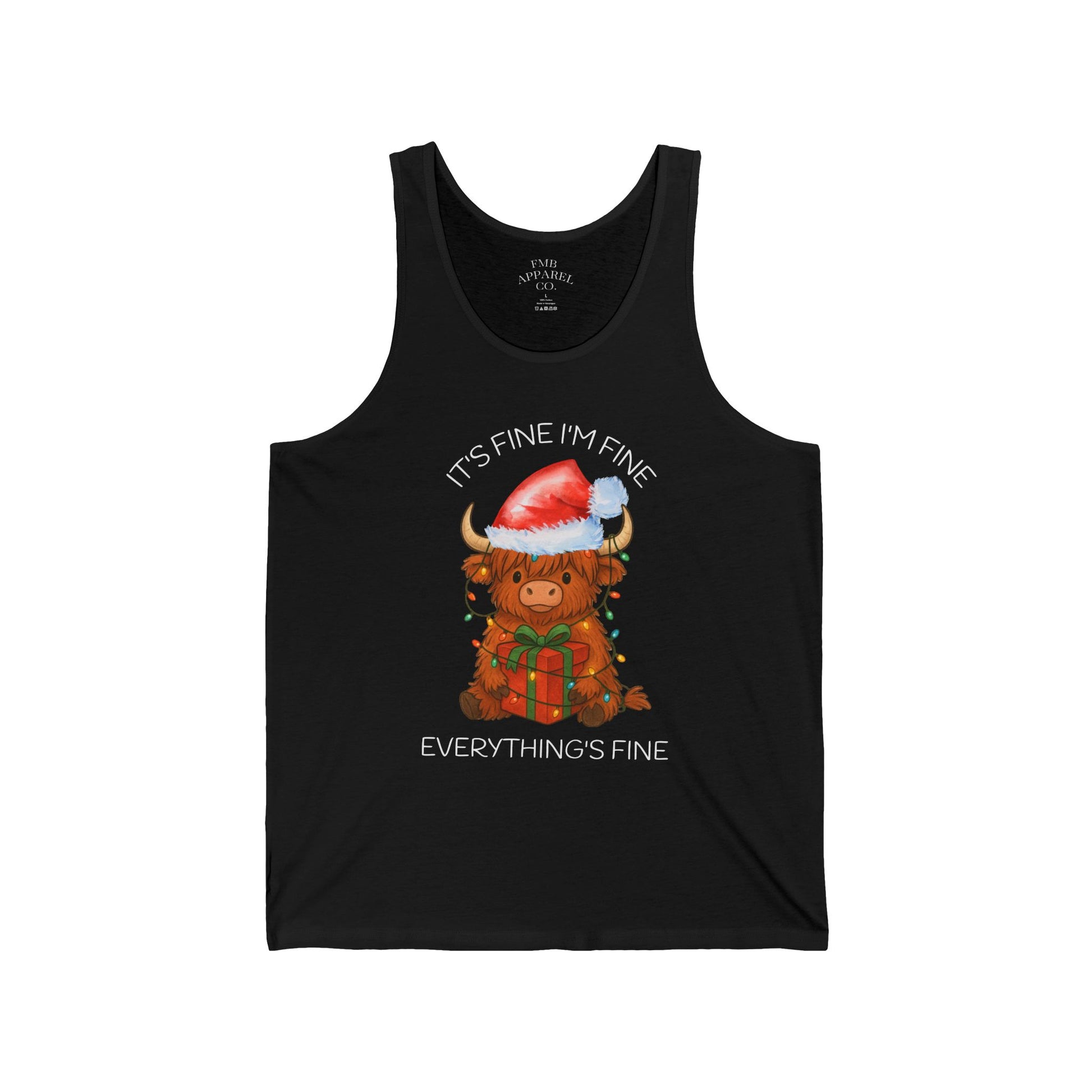 Lightweight and cheerful, this jersey tank brings a cozy bit of holiday whimsy to warm-weather gatherings and layered winter looks. A highland cow wears a fuzzy Santa hat, framed by the gentle line “It’s fine I’m fine Everything’s fine.” The soft, airy fabric drapes easily for a relaxed retail fit — wear it solo on sunny days or under an open flannel when the temperature dips. It’s the kind of piece that sparks a smile at a drive-in carol, a fireside cocoa meet-up, or a playful holiday photo with friends. Thoughtfully constructed with side seams and self-fabric binding, it stays structured wash after wash while the tear-away label keeps the neckline comfy. Runs true to size and made with breathable Airlume cotton blends, this tank keeps the focus on comfort and festive charm.